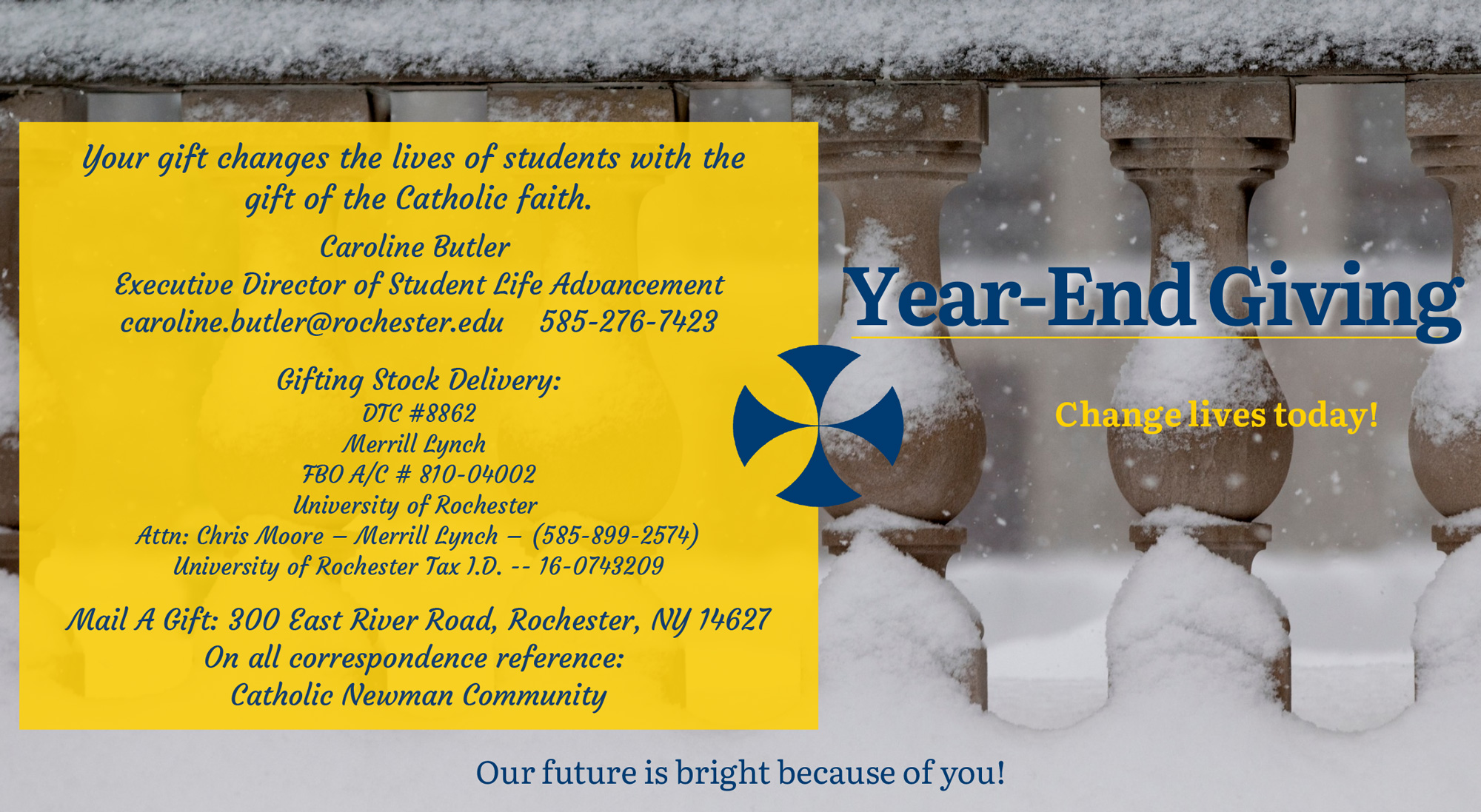 The Catholic Newman Community at the university of Rochester welcomes you to celebrate, explore, and develop your faith with us! We gather for mass every Sunday and host over 100 social, intellectual and service programs each semester. Additionally, we provide opportunities for service, leadership, and pastoral care for all.